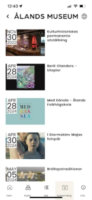 Hold deg oppdatert på alt som skjer! Appens hendelseskalender er din personlige guide til et rikt program av aktiviteter. Her finner du fersk informasjon om temaguidinger, hyggelige kulturlørdager, spennende skoleferieaktiviteter, stemningsfulle julemarkeder, den tradisjonsrike Skördefesten, Kulturnatten, og mye mer. Ålands museum representerer en imponerende samling av tolv ulike museer og severdigheter, og tilbyr noe for enhver smak og interesse.
