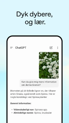 Med ChatGPT er dine ideer og spørsmål aldri langt unna. Aktiver talemodus via hodetelefonikonet for sømløse samtaler mens du er i bevegelse, la appen fortelle en beroligende godnatthistorie, eller bruk den til å avgjøre kveldens debatter. Du kan også berike din dialog ved å laste opp bilder – enten for å digitalisere en håndskrevet oppskrift eller for å få dypere innsikt om et fascinerende landemerke du nettopp har fotografert.