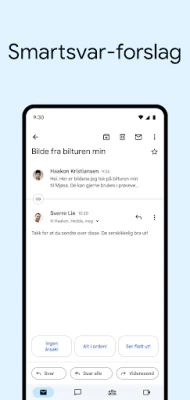 Optimaliser hverdagen din med intelligente funksjoner designet for å spare deg tid. Få forslag til smarte svar som gjør e-postbesvarelser raskere, og søk lynraskt gjennom dine meldinger med umiddelbare resultater og forslag mens du skriver. Gmail gir deg full fleksibilitet med enkel veksling mellom flere kontoer og tilpassbare varsler for varselsenteret, merker og låseskjermen, slik at du aldri går glipp av noe viktig. Organiser innboksen din uanstrengt med intuitive sveipebevegelser for arkivering eller sletting, etiketter, stjernemerking og rapportering av søppelpost, alt presentert i oversiktlige samtaletråder. For ekstra bekvemmelighet, nyt automatisk utfylling av kontaktnavn og en praktisk infobrikke på din Wear OS-klokke for rask e-postoversikt.