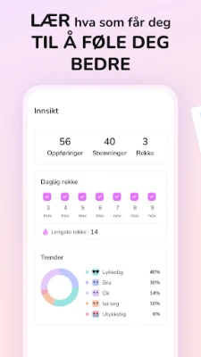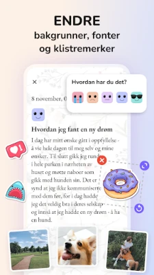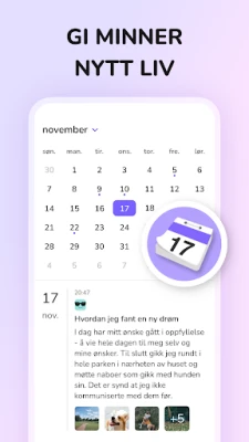 Gjør mer enn å bare skrive; forvandle oppføringene dine til en levende fortelling med bilder. Enten det er et inspirerende øyeblikk, en spesiell begivenhet, eller bare en stemning du vil huske, kan du enkelt legge ved bilder for å gi minnene dine liv og skape en rik fotodagbok. Hold også oversikt over følelsene dine med den integrerte humørsporeren. Ved å registrere humøret ditt daglig, får du verdifull innsikt i hva som påvirker ditt velvære, og kan identifisere mønstre som hjelper deg å forstå deg selv bedre. Den innebygde kalenderfunksjonen lar deg organisere tanker og planer sømløst, og gjør det enkelt å finne tilbake til tidligere oppføringer eller forberede deg på kommende hendelser og avtaler.