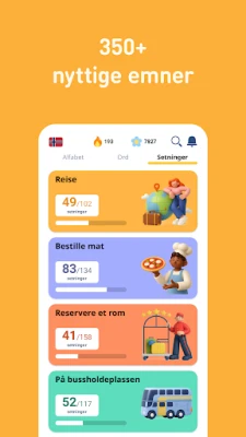 FunEasyLearn tilbyr en rikdom av innhold designet for å bygge ditt språklige fundament steg for steg. Utforsk over 6 000 nøye utvalgte norske ord, inkludert de mest essensielle substantivene, adjektivene og verbene, strukturert i 7 nivåer og fordelt på 200 spennende emner som stadig utvides. I tillegg får du tilgang til mer enn 5 000 dagligdagse norske uttrykk, ideelle for både samtale og reise, organisert i 10 nivåer og 120 relevante emner. Denne omfattende samlingen sikrer at du lærer nøyaktig det du trenger, enten du er nybegynner, viderekommen eller har et avansert nivå.