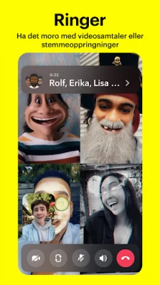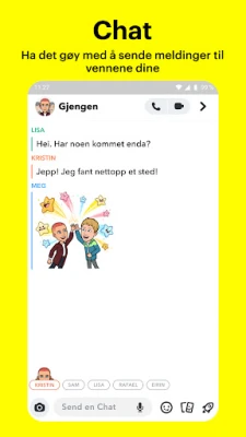 Dyk inn i en verden av umiddelbar kommunikasjon og kreativitet med Snapchat. Appen starter rett i kameraet, slik at du øyeblikkelig kan fange øyeblikket – enten det er et raskt bilde med et enkelt trykk eller en video du tar opp ved å holde nede. Slipp løs din personlighet og kreativitet med et stadig voksende utvalg av Linser, dynamiske Filtre og personlige Bitmojier. Opplev nye, spennende Linser som det globale Snapchat-fellesskapet skaper hver eneste dag. Hold kontakten med venner gjennom sanntidsmeldinger, del deres dag i Gruppehistorier, og start videochatter med opptil 16 venner samtidig – alt mens dere kan bruke interaktive Linser og Filtre. Uttrykk de unike båndene med Friendmojier, skreddersydde Bitmojier laget spesifikt for deg og en venn.